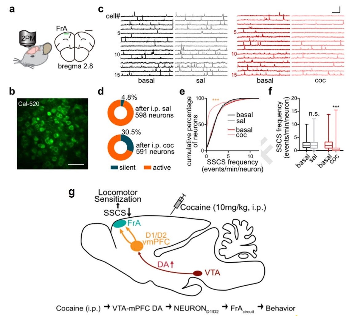 生命学院王昌河课题组联合北京大学未来技术学院周专团队开展研究,该研究联合使用两项高难度清醒动物生理记录技术:双光子对小鼠大脑PFC深层神经元网络Ca2+成像和peg-CFE记录PFCDA分泌信号,实时记录FrA神经网络中的神经元群活动(同时长时程记录~50个神经元),发现急性可卡因注射抑制了FrA II/III层兴奋性神经元的兴奋性。通过化学遗传学直接操控这类神经元的兴奋性能调控可卡因诱导的运动敏化行为。借助病毒工具、离体脑片电生理、活体小鼠电化学、双光子成像、药物颅内注射等一系列手段,创新性地鉴定了一条参与调控可卡因敏化行为的新环路:腹内侧前额叶皮层-额叶联结皮层(vmPFC-FrA)。进一步,发现可卡因对 FrA 神经元活动的抑制作用依赖于vmPFC脑区的多巴胺转运体(DAT),即可卡因通过阻断vmPFC区域多巴胺神经末梢上的DAT,增加局部多巴胺的浓度,从而激活或抑制D1 D2受体阳性vmPFC神经元,vmPFC 神经元进而调控其下游FrA 神经元活动和可卡因敏化行为。该研究为可卡因的敏化行揭示了PFC亚区域之间的环路新机制,新的成瘾机制理论将为可卡因等成瘾性药物的戒断提供重要理论依据和方向。该研究首次发现内侧前额叶皮层(medial prefrontal cortex, mPFC)—额叶联结皮层(Frontal associationcortex FrA)之间的新神经投射环路,并揭示该环路(vmPFC-FrA)在可卡因敏化行为调控的中的核心作用与作用机制。