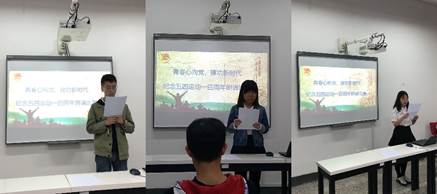 黄家豪、郭明蕊两位团支书以“伟大的五四运动与五四精神”为主题讲授团课,带领同学们回顾五四爱国运动历史,讲解以“爱国、进步、民主、科学”为核心的五四精神,强调了作为新时代的青年,大家应当肩负起新的使命与责任,要为实现中国梦而贡献自己的力量。