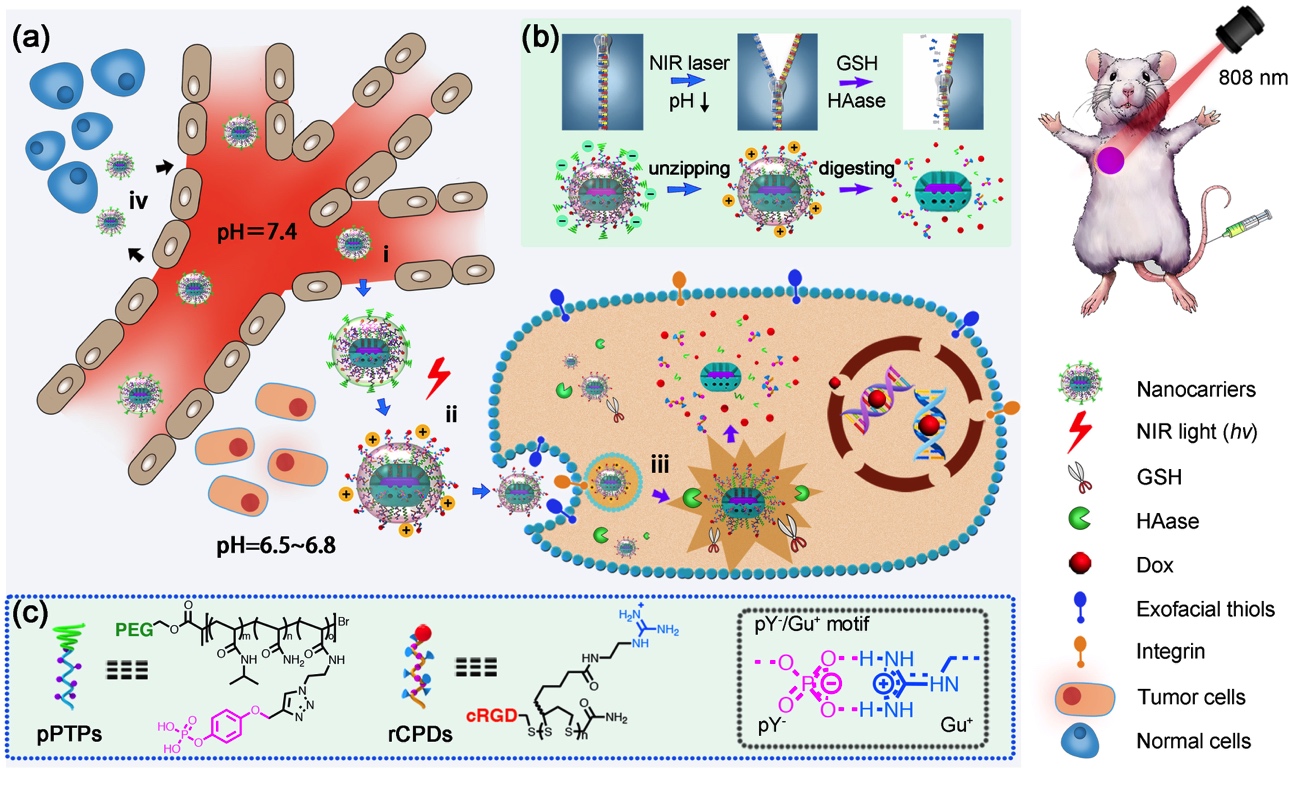 近日,来自西安交通大学仿生工程与生物力学中心(BEBC)和南京大学生命分析化学国家重点实验室的研究团队开发了一种多重响应的仿生分子拉链,并将其用于纳米药物载体表面性质的精确操控,实现了对肿瘤细胞的精准靶向和药物治疗。受自然界中蛋白质分子通过翻译后修饰调控自身结构和功能的启示,研究人员设计和合成了两种新型仿生聚合物:含胍基的双硫聚合物与含磷酸化酪氨酸残基的温敏聚合物,并利用胍基和磷酸基团的多重盐桥作用构建了对pH/温度/氧化还原敏感的分子拉链。通过在肿瘤部位施加近红外激光照射,纳米粒子表面性质发生反转,促进了肿瘤细胞的吸收,增强了药物治疗效果。作为纳米科学前沿发展方向,纳米粒子表面的精准操控极具研究价值,该工作提供了一种全新的纳米材料表面修饰策略,将极大推动纳米材料组装、生物仿生材料制备、纳米医药临床转化等领域的发展。