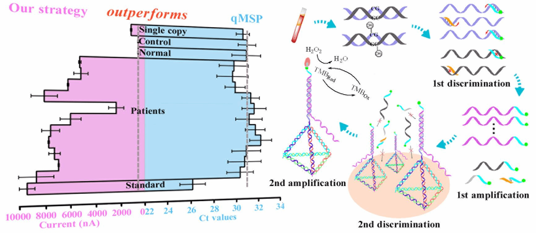 循环甲基化DNA是指细胞破裂或死亡时释放到循环系统中的甲基化DNA片段,作为新型的非侵入性癌症标志物,有望取代侵入性的组织活检。然而,其血液含量极低(< ng/ml),且存在大量序列相同的非甲基化dna,识别干扰大,检测很困难。传统方法荧光定量甲基化特异性pcr(quantitative methylation-specific pcr, qmsp)存在显著的引物二聚体和脱靶扩增等非特异性干扰,严重限制临床样品的精准分析。