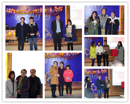 歌曲联唱《卡农的夏天》、《爱之初体验》、《我要你》、《亲爱的》、《广岛之恋》等轮番登场,或活泼动感,或浪漫温馨,或轻快悠扬,风格各异,变幻多姿。由同学们自编自导的小品《甄嬛传》、相声《梦想青年》等节目用惟妙惟肖的表演、别出心裁的服装和令人捧腹的角色反串,引得观众爆笑连连。热舞《After Hours》用动感的舞步彰显了同学们丰富多彩的校园生活和活泼阳光的青春风采。诗朗诵豪迈奔放、意境深远;吉他和二胡的合奏,现代与古典的碰撞,均赢得阵阵掌声。更有神秘嘉宾田中民老师现场演绎温情歌曲《母亲》,深情的演唱打动全场观众。节目中间穿插的抽奖环节以及师生共同合作的小游戏环节,把气氛推向一个又一个高潮。在《相亲相爱一家人》合唱中,联欢会圆满落幕。