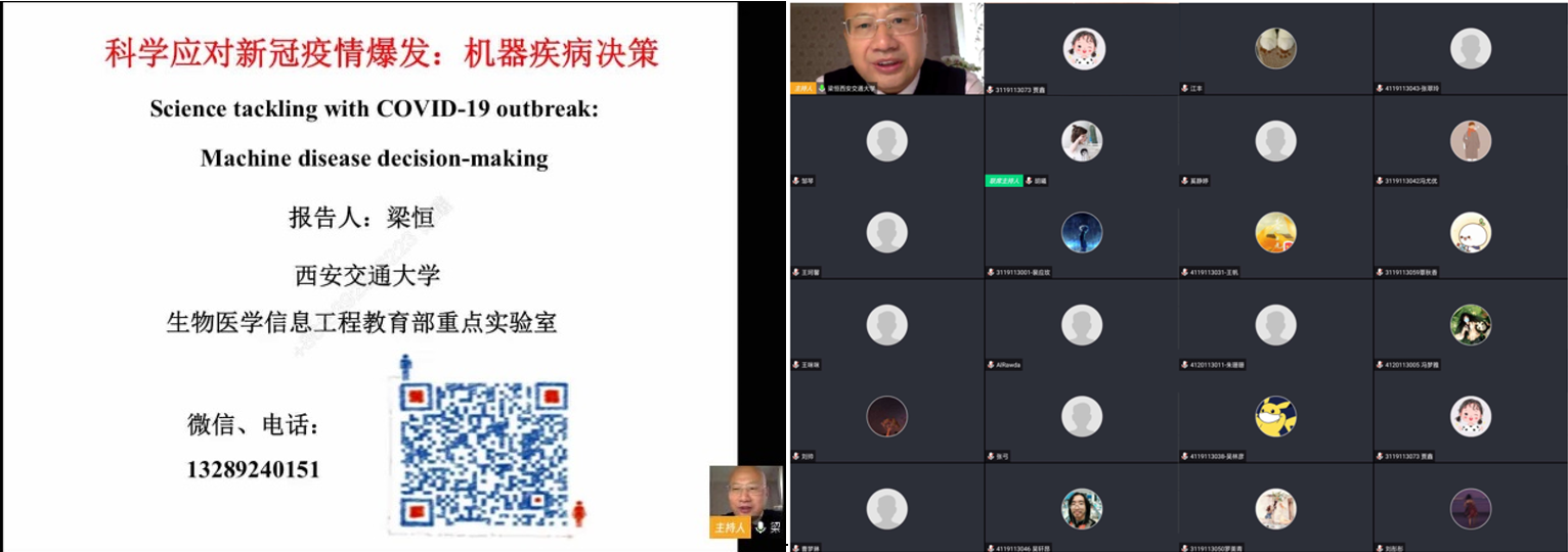 3月12日下午,生命学院创新港系列报告第十三期在腾讯会议平台召开。本次报告邀请生物医学光子学与传感研究所梁恒教授,以“科学应对新冠疫情爆发:机器疾病决策”为题进行交流。本次报告是本学期的第二场报告会,采取线上收听和线上讨论的形式,共80名师生听取报告。