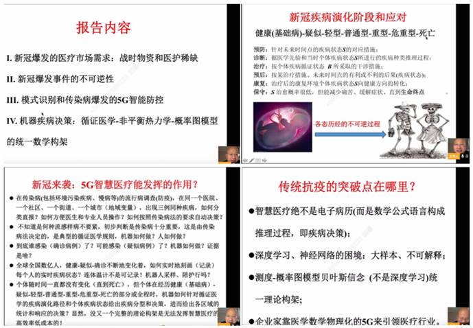 会上,梁恒教授分别从新冠爆发的医疗市场需求、新冠爆发事件的不可逆性、模式识别和传染病爆发的5G智能防控、机器疾病决策模型构建4个方面,对应用数学模型构建智慧医疗体系进行疾病决策的方法进行了深入探讨。梁教授提出,开发疾病决策模型,根据循证医学的疾病演化路径和个体疾病状态给出疾病分型和决策,进而做出各区域的统计和响应决策,在新型冠状病毒等突发传染病的科学防控和治疗中具有重要应用价值。
