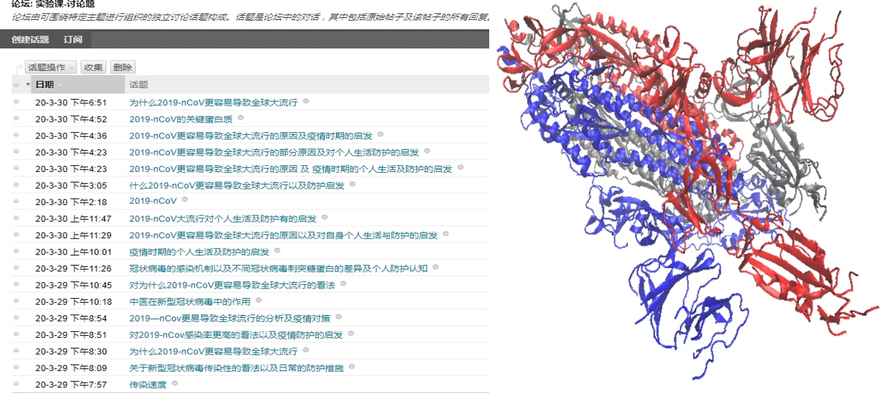 《生命科学基础Ⅰ》课程面向全校非生物专业本科生开设,旨在培养学生基本生命科学素养和能力,使其掌握生物学研究方法、思路,具备从事本专业与生命科学交叉领域创新工作的能力。在本学期《生命科学基础Ⅰ》课内实验“生物大分子结构模拟”实验中,教师将抗疫知识与课程教材相结合,把新型冠状病毒相关内容融入到"线上课程"的教学中:在了解病毒的基本结构,病毒感染人体细胞的基本原理和过程等知识的基础上,同学们学会了利用计算机来模拟、观察冠状病毒在感染过程中的关键蛋白质分子(刺突糖蛋白,Spike glycoprotein)的空间三维结构,并对不同冠状病毒(新型冠状病毒、SARS病毒)的刺突糖蛋白空间结构进行比较。通过课程学习,学生对新型冠状病毒有了更直观地认识,并从生物大分子结构的角度了解到不同冠状病毒传染性不同的原因。