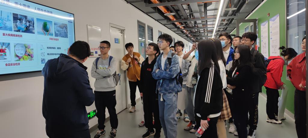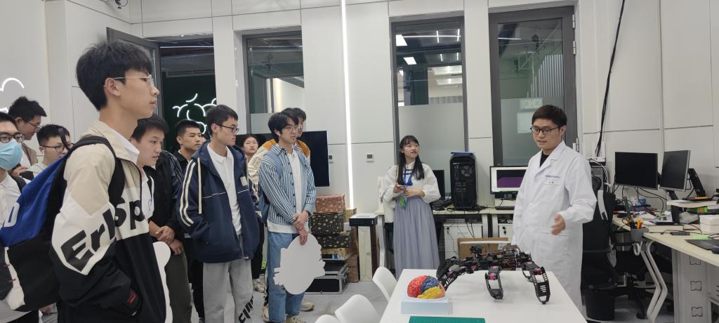 在班主任、本科生导师、研究生志愿者的带领下,同学们参观了生物医学与健康工程研究院,各系所中心教师为学生细致地讲解实验仪器和取得的科研成果等。“在医学健康大背景下如何进行数据挖掘?”“这个研究的应用场景是什么样的?”同学们对研究院的各类科研方向产生极大的兴趣,参观途中与老师和研究生学长学姐展开深入交流。