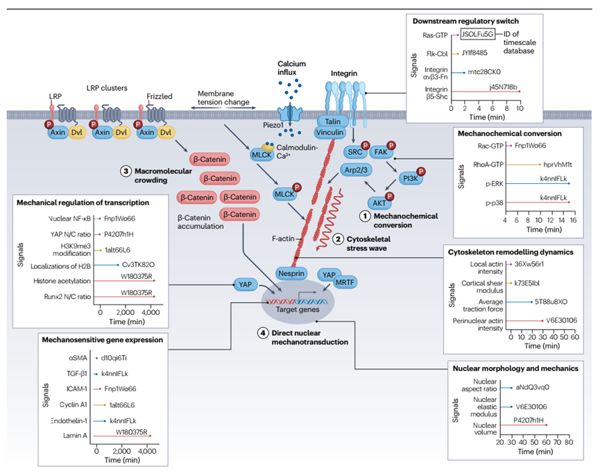 在生物学和医学研究中,力学信号(如压力或拉伸)如何影响细胞行为是一个关键问题。但现有研究往往只关注某个时间尺度,比如毫秒级的快速反应或跨年度的长期变化,缺乏将不同时间尺度整合起来的系统性分析。这导致我们无法全面理解力学信号从触发到最终影响细胞功能的完整过程,从而限制了在组织发育、疾病防治等方面的应用。