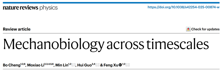 该成果以《跨时间尺度的力学生物学》(“Mechanobiology across timescales”)为题在《自然综述物理》(Nature Reviews Physics)上在线发表。西安交通大学生命学院程波及李墨筱为论文第一作者,西安交通大学生命学院徐峰教授,林敏教授及西安交通大学第二附属医院郭卉教授为共同通讯作者。该研究得到国家自然科学基金重点/面上项目、中央高校基本科研业务费等项目以及教育部生物医学信息工程重点实验室、国家医学攻关产教融合创新平台等基地的支持。