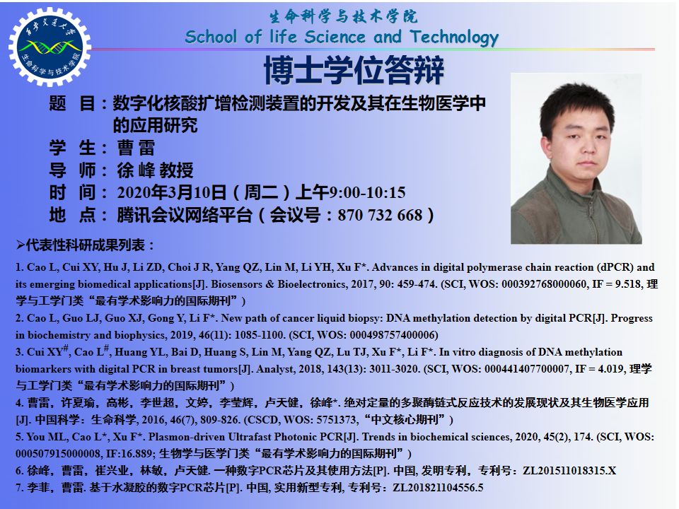 4.曹雷,许夏瑜,高彬,李世超,文婷,李莹辉,卢天健,徐峰*.绝对定量的多聚酶链式反应技术的发展现状及其生物医学应用[J].中国科学:生命科学, 2016, 46(7), 809-826. (CSCD, WOS: 5751373,“中文核心期刊”)