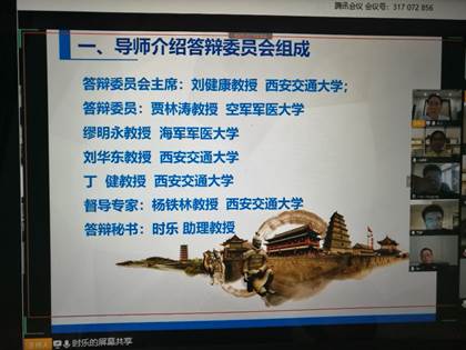 会议开始时,首先由导师龙建纲教授介绍本次参加答辩的委员会组成。答辩委员会主席由西安交通大学刘健康教授担任,委员由空军军医大学贾林涛教授、海军军医大学缪明永教授、西安交通大学刘华东教授和丁健教授组成,研究生院邀请的校级督导专家为西安交通大学杨铁林教授,答辩秘书由西安交通大学时乐助理教授担任。