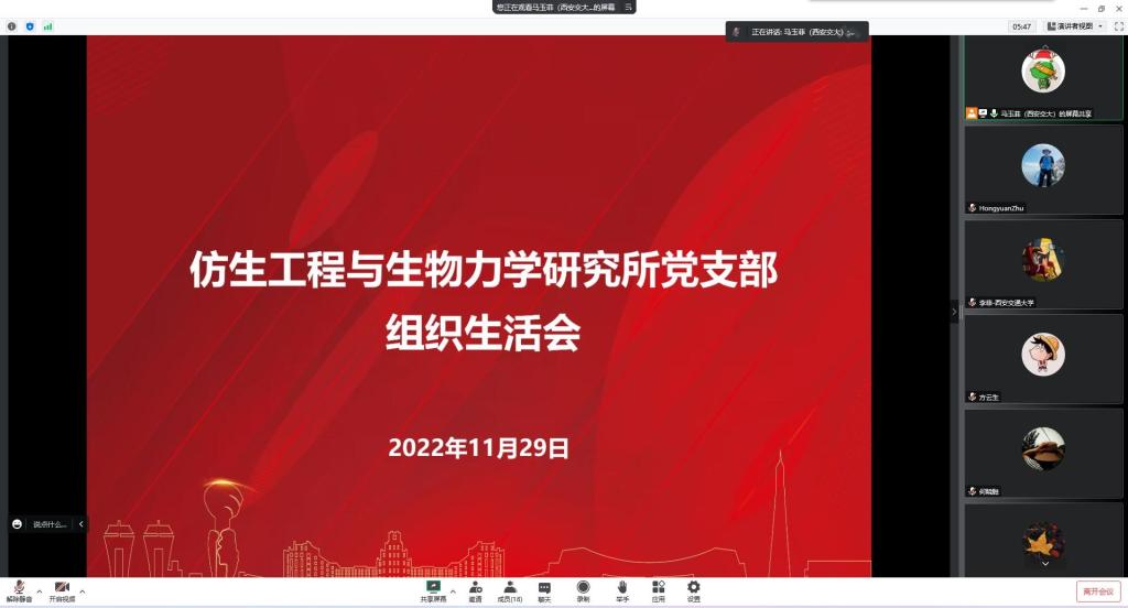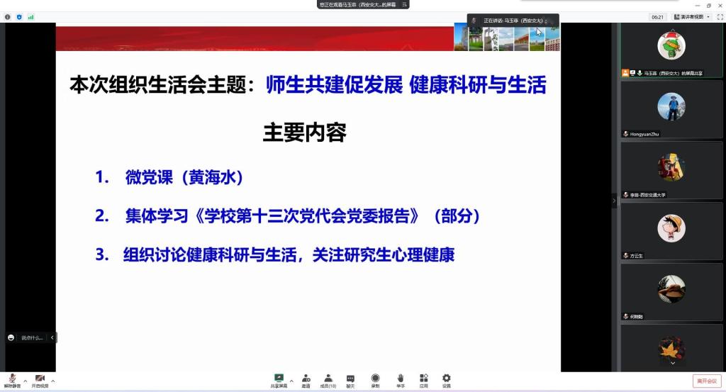 121日,仿生工程与生物力学研究所教工党支部线上开展“师生共建促发展 健康科研与生活主题党日活动,组织生活由支部组织委员马玉菲老师和党支部书记李菲共同主持。