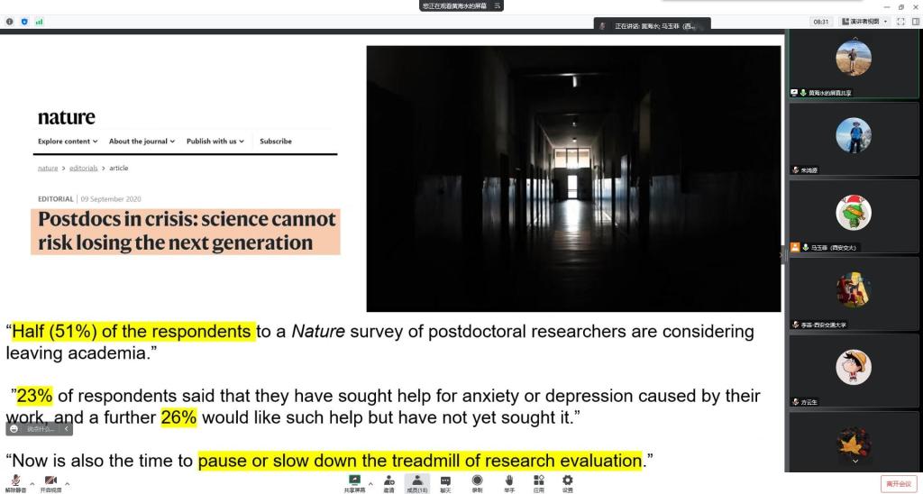 首先是研究所副所长黄海水老师带来关于青年学者心理健康的微党课。黄老师总结了疫情影响下,青年科学家面对的就业、工作进展、学术交流方面的心理压力,并针对这些压力提出了五点平衡生活与科研工作的建议:(1)设定现实的小目标;(2)区隔一个工作区;(3)劳逸结合;(4)多听多看多交流;(5)调整心态,适应落差。