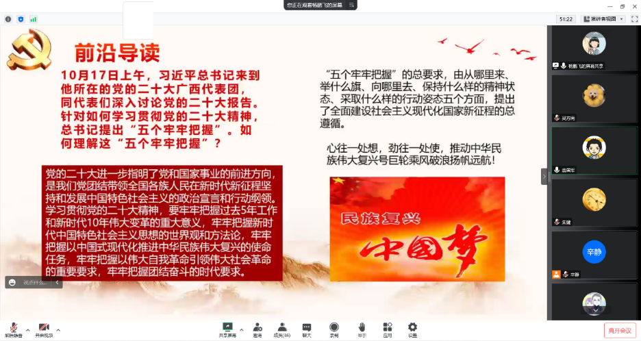 杨鹏飞博士作题为《如何学习贯彻党的二十大精神》党课。翁国军书记提出,师生不仅要学会学习二十大报告,还要结合实际科研工作,将二十大精神落在实处,用实际行动践行初心使命。