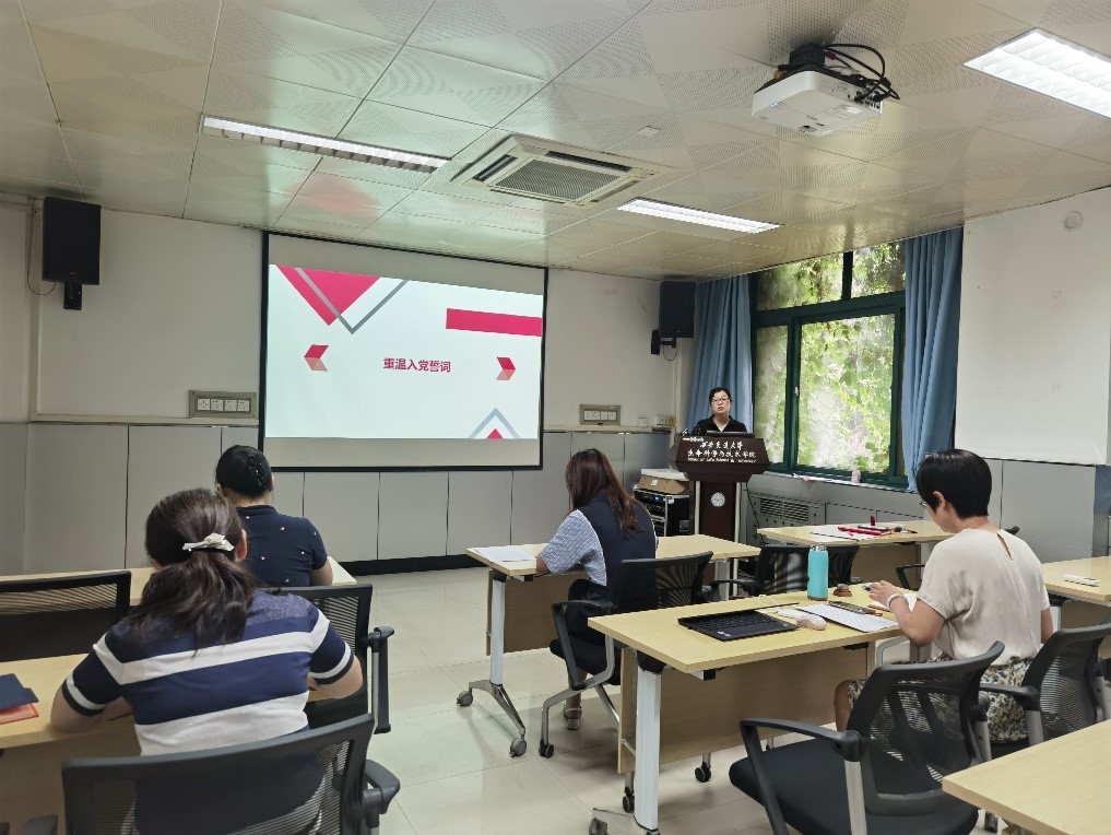 在党课讲授环节,分党委书记刘茹以“重温入党誓词 探寻信仰力量”为题讲述了入党誓词在土地革命时期、抗日战争时期、解放战争时期、新中国成立时期、十二大至今五个历史阶段的演变,“永不叛党”是入党誓词永恒的内容,不改的是“为共产主义事业奋斗终生”。她还介绍了西安交大党史中的许多“第一”,回顾了百年之中,正是在党中央的领导下,交大人走出了“扎根西部 服务国家 世界一流”的独特发展道路。 此外结合党史教育,刘茹从坚持科学的理论指导、坚定的理想信念、强大的组织优势、坚实的群众基础以及彻底的自我革命五个方面解读了“中国共产党为什么‘能’”这一问题,将中国共产党成立100年以来形成的理论体系、开展的思想建党、理论强党的主题教育、组织体系建设、社会主要矛盾的变化以及自我革命融入其中,为党员们做了一次深刻的党课教育。张瑞以“走进渔阳里-重温党史上的诸个‘第一'”为题向支部党员讲述了上海渔阳里作为中国红色之路的起点的光荣历史,诞生中国第一个共产党早期组织,见证《共产党宣言》首个中文全译本的校对和出版,创建中国首个青年团组织的革命圣地等,通过党史学习教育鼓舞斗志,明确方向,坚定信心,砥砺前行。